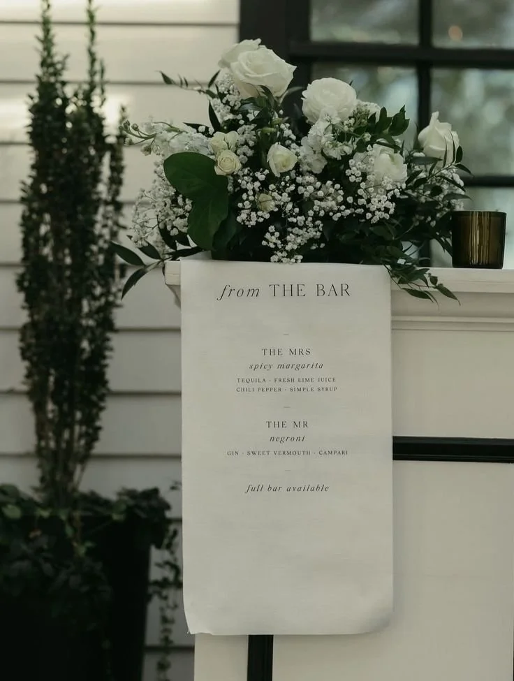 Custom bar sign on linen fabric. This is typically hung over the bar at the event. This can list the bar items, decorate last name or other information.